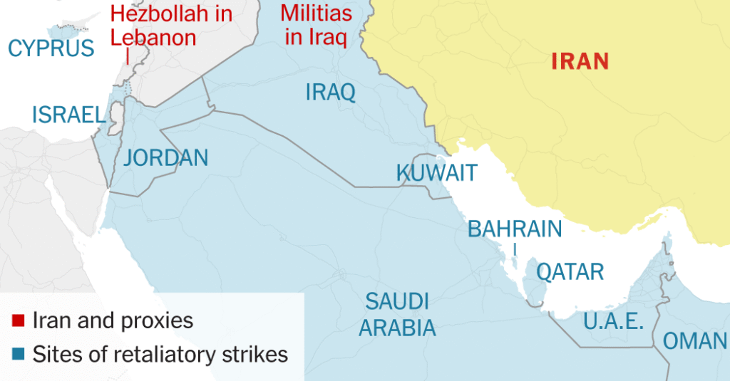 Iran retaliated the same day by launching ballistic missiles and drones toward Israel and US bases across the Gulf, including Bahrain, Kuwait, Qatar, and the UAE (300+ projectiles akin to April 2024 barrage), disrupting airports, causing light damage to Israeli bases, and 8 Gulf casualties despite 99% interception. Iranian officials declared the strikes a “declaration of war,” vowing escalation.